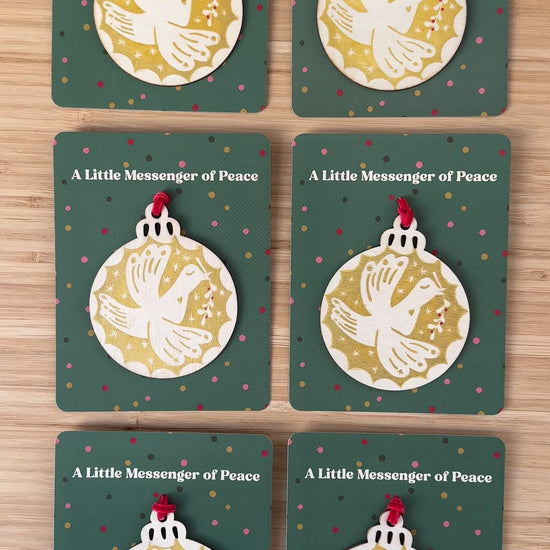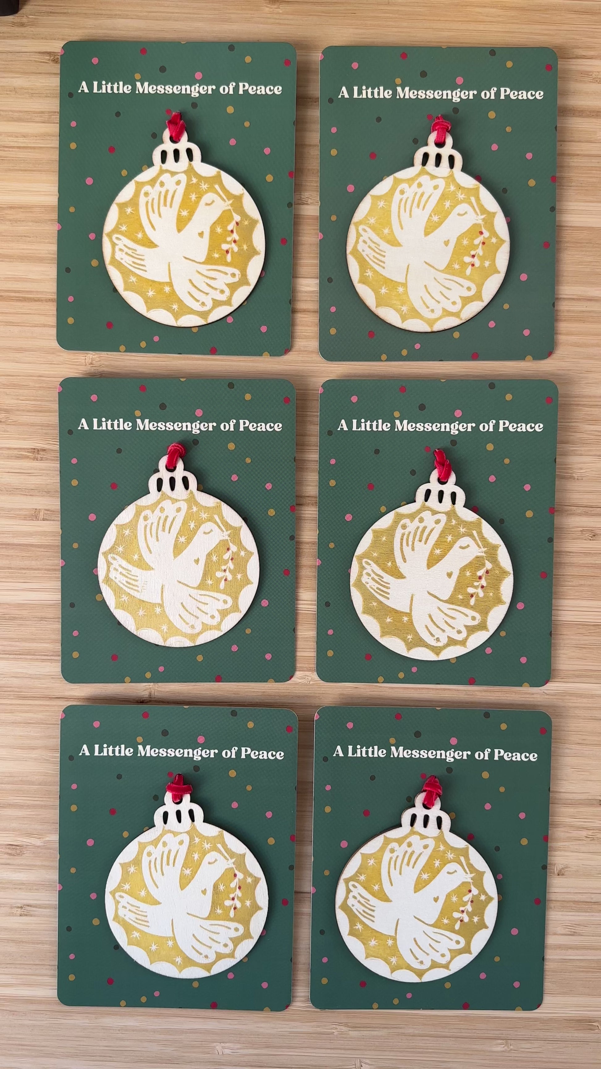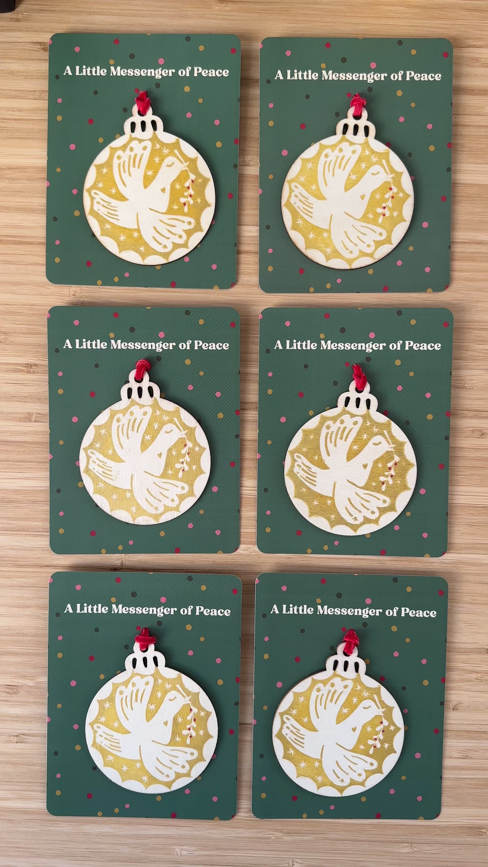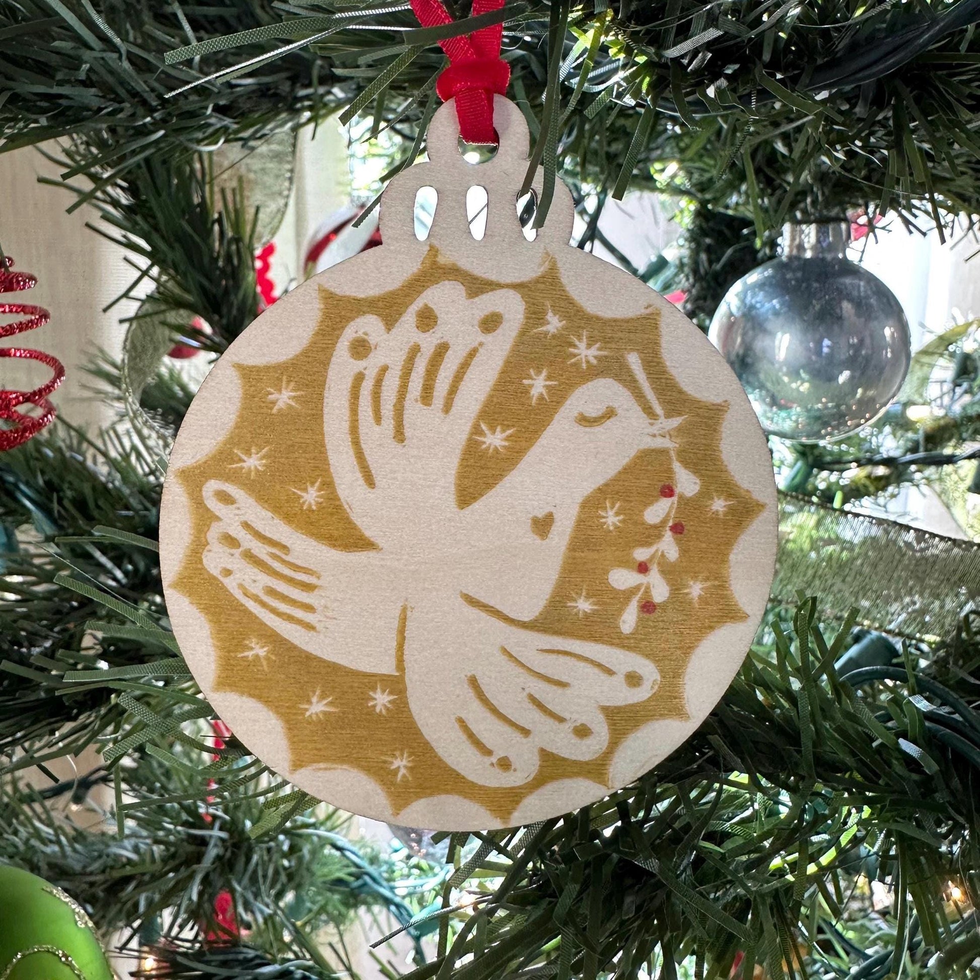 This Scandinavian Christmas ornament is a gold holiday home accent, perfect as a minimalist Christmas tree decoration. This handmade modern wood dove ornament features a peace design and makes a thoughtful gift. It is a unique and beautiful addition to your Christmas decor, symbolizing peace and hope during the holiday season.